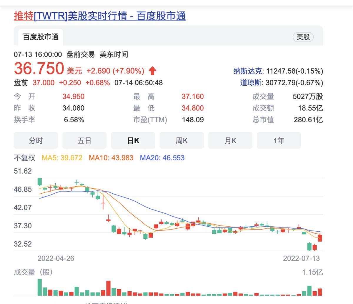 继马斯克以推特提供虚假数据为由终止收购之后,7月12日,推特正式在特拉华州一法院提起诉讼,要求马斯克按照4月约定的每股54.2美元完成收购。在诉状中,推特批评马斯克的行为不仅已经压低了推特股价,还使推特和此次收购看起来像一个“精心制作的笑话”。分析称,未来无论收购是否执行,推特所面临的情况都岌岌可危。一方面目前马斯克对其虚假账户数量的质疑已影响到其用户认同和股价,另一方面,经济放缓正在冲击网络广告投放。推特作为一家依赖网络广告收入的科技公司,这一行业环境使其处境更是雪上加霜。截至发稿,推特股价已跌至36.75美元,仅为收购价的七成。