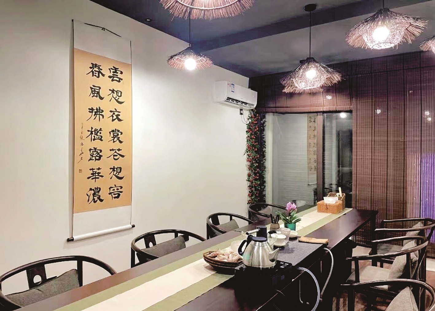 走进这间名为“玉楼春”的房间,静谧古典的气息扑面而来。极目新闻记者看到,房间内摆设均为中国传统风格,木质桌椅富有光泽,茶杯器皿触感怡人,墙壁上还展示有古典书画作品。房间正中间摆有一张古色古香的横条桌,以及几个藤编蒲团、几幅插画,清雅十足。茶桌上,烧水泡茶的器具、茶叶、茶具一应俱全。