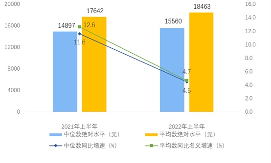 上半年,全国居民人均可支配收入中位数15560元,增长4.5%,中位数是平均数的84.3%。其中,城镇居民人均可支配收入中位数22324元,增长3.8%,中位数是平均数的89.3%;农村居民人均可支配收入中位数8410元,增长5.7%,中位数是平均数的85.9%。