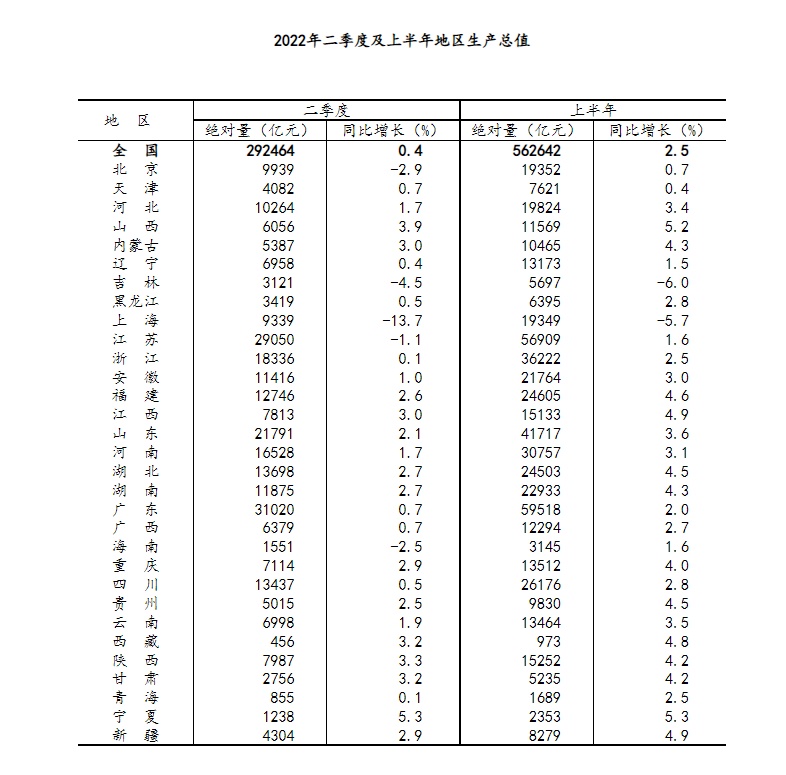 人民网北京7月15日电 (记者杨曦)国家统计局今日发布2022年二季度31省份GDP数据。