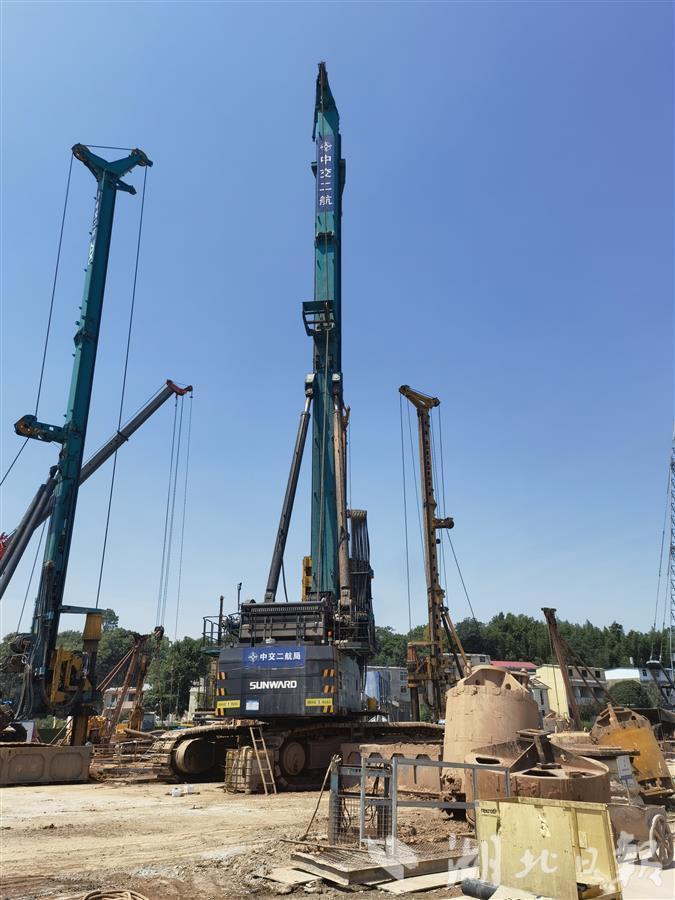湖北交投燕矶桥公司、中交二航局项目部协商决定,投入2000多万元,引进国内最大功率的旋挖钻机参与主墩桩基施工。它配置了双动力五马达,整机重达450吨,相当于近400辆小轿车的重量,最大钻孔直径可达7米,最大钻孔深度可达170米,满足超大直径深孔高硬度嵌岩成桩的要求。