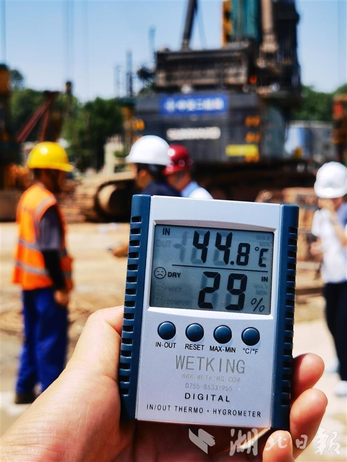 44.8摄氏度!在这台国内顶尖的山河智能旋挖钻机旁,湖北日报全媒记者拿温度计测出实时温度。然而,这根“超级钻”却不惧高温,一米米坚定地往地下掘进。司机赵师傅正在10多米高的驾驶室内从容操控。
