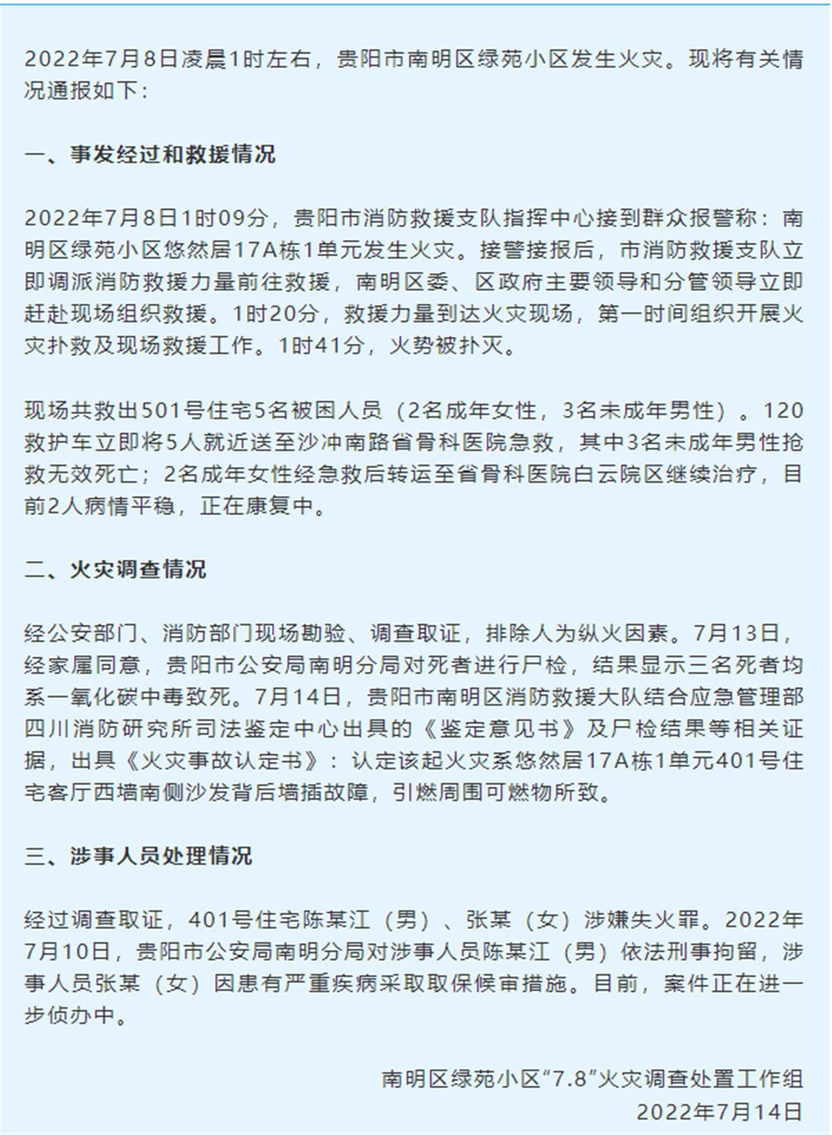 14日,南明区绿苑小区“7.8”火灾调查处置工作组发布情况通报称,2022年7月8日1时09分,贵阳市消防救援支队指挥中心接到群众报警,南明区绿苑小区悠然居17A栋1单元发生火灾。接警接报后,市消防救援支队立即调派消防救援力量前往救援。1时20分,救援力量到达火灾现场,第一时间组织开展火灾扑救及现场救援工作。1时41分,火被扑灭。现场共救出501号住宅5名被困人员(2名成年女性,3名未成年男性)。120救护车立即将5人就近送至沙冲南路省骨科医院急救,其中3名未成年男性抢救无效死亡;2名成年女性经急救后转运至省骨科医院白云院区继续治疗,目前2人病情平稳,正在康复中。通报称,经公安部门、消防部门现场勘验、调查取证,排除人为纵火因素。