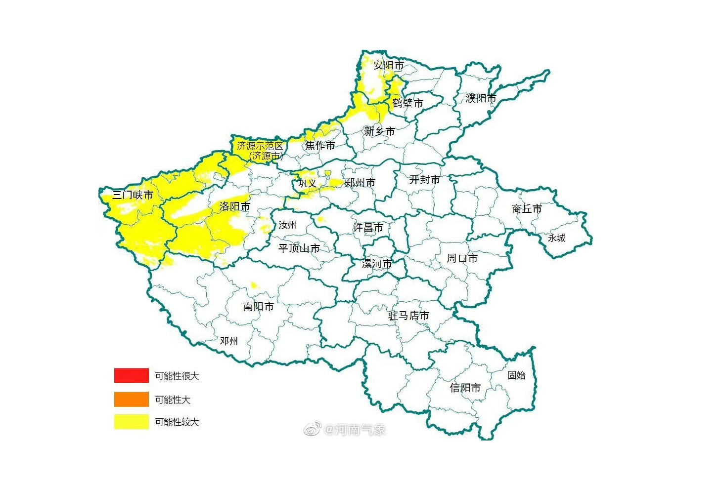 河南省自然资源厅、河南省气象局15日联合发布河南省地质灾害气象风险预警:2022年7月15日20时至16日20时,河南省地质灾害气象风险预警达到黄色预警的地区为:洛阳、三门峡、济源大部,安阳中部、北部、西部、南部局部,鹤壁、新乡、焦作西北部局部,郑州西部局部,许昌西北部局部,南阳西北部及北部局部,发生地质灾害的可能性较大。