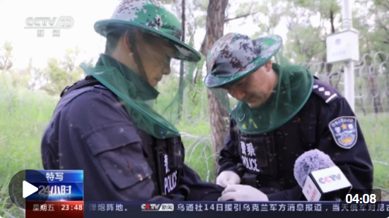 新疆科克托海中心边境警务站站长吾拉别克·马吉提别克:最早没有这个防蚊帽的时候,我们都是买的成卷的纱布、纱网然后就套到头上,拿绳子在脖子这块缠一下,手脚缠上以后就这样走。