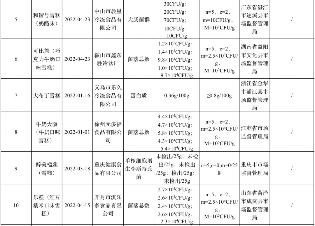 2022年上半年冷冻饮品(雪糕)不合格信息
