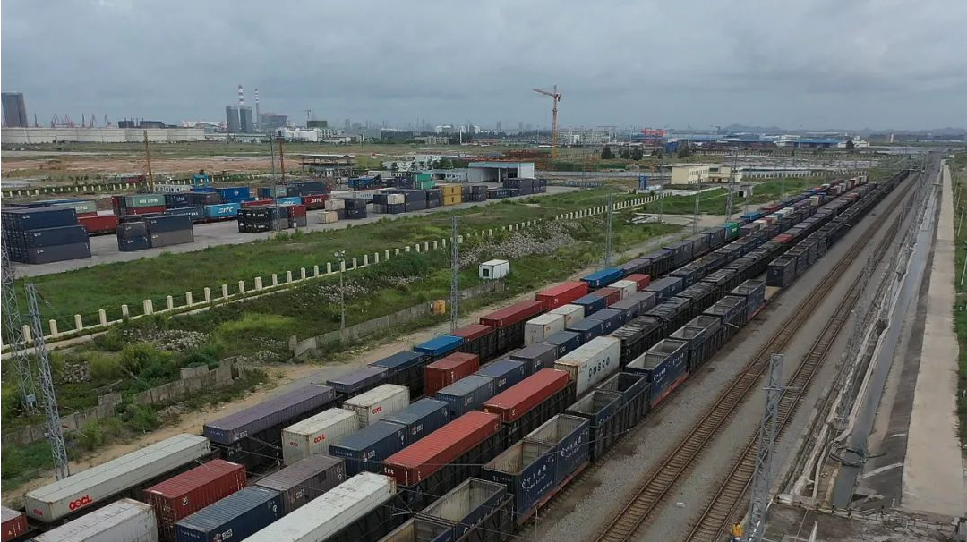 2022年7月9日,在钦州港东站,货列占满轨道依次发车。中国铁路南宁局集团有限公司信息显示,上半年,西部陆海新通道铁海联运班列累计发送集装箱37.9万标箱,同比增长33.4%。 新华社记者 张爱林 摄