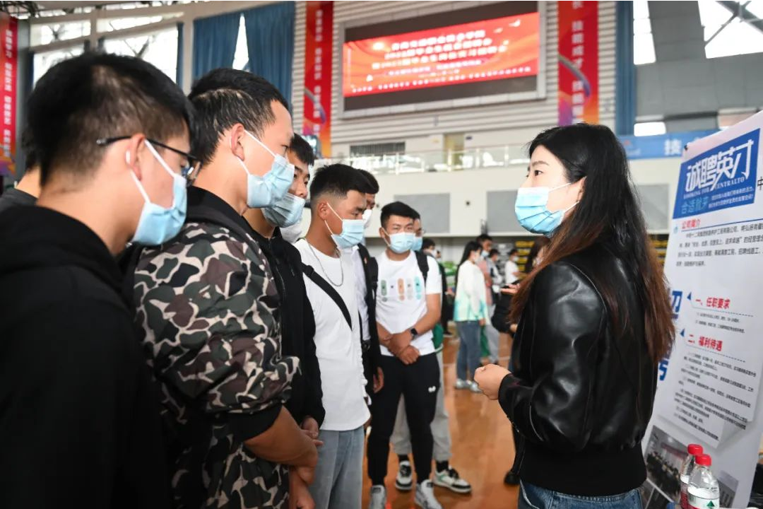 2022年6月26日,青海交通职业技术学院举行2023届学生岗位实习暨2022届高校毕业生校园招聘会,学生与招聘单位代表(右一)交流。 新华社记者 张龙 摄