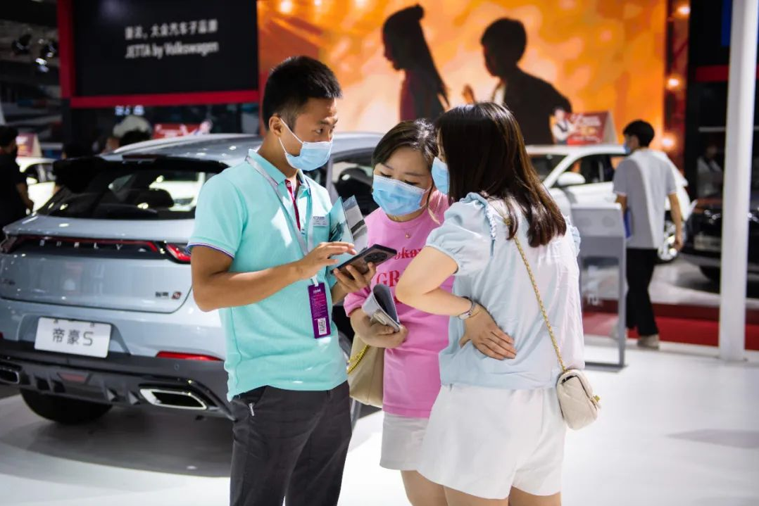 2022年7月13日,2022湖南汽车展览会暨长沙市汽车消费节在位于长沙的湖南国际会展中心举行。在湖南国际会展中心,工作人员(左一)向观众介绍产品。 新华社记者 陈思汗 摄