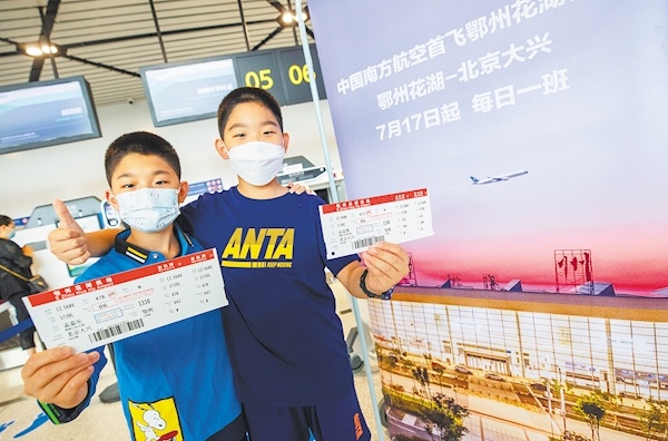 小哥俩展示CZ5680次航班登机牌。这是从花湖机场起飞的首趟客运航班,前往北京大兴机场。