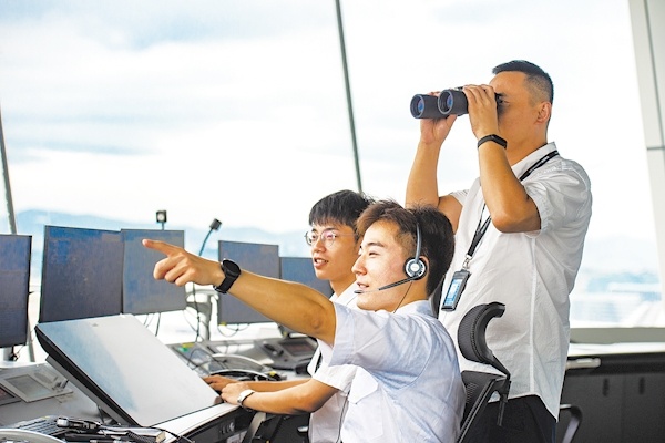 7月17日,鄂州花湖机场塔台工作人员用望远镜观察场内,及时调度。