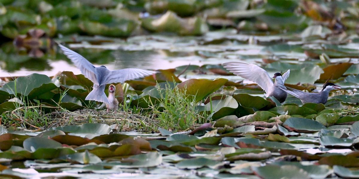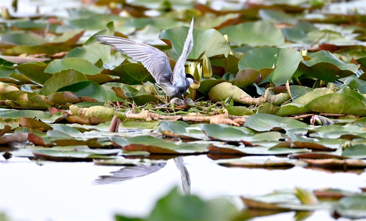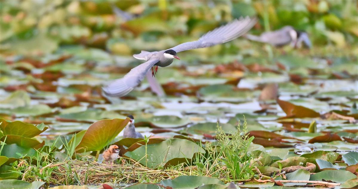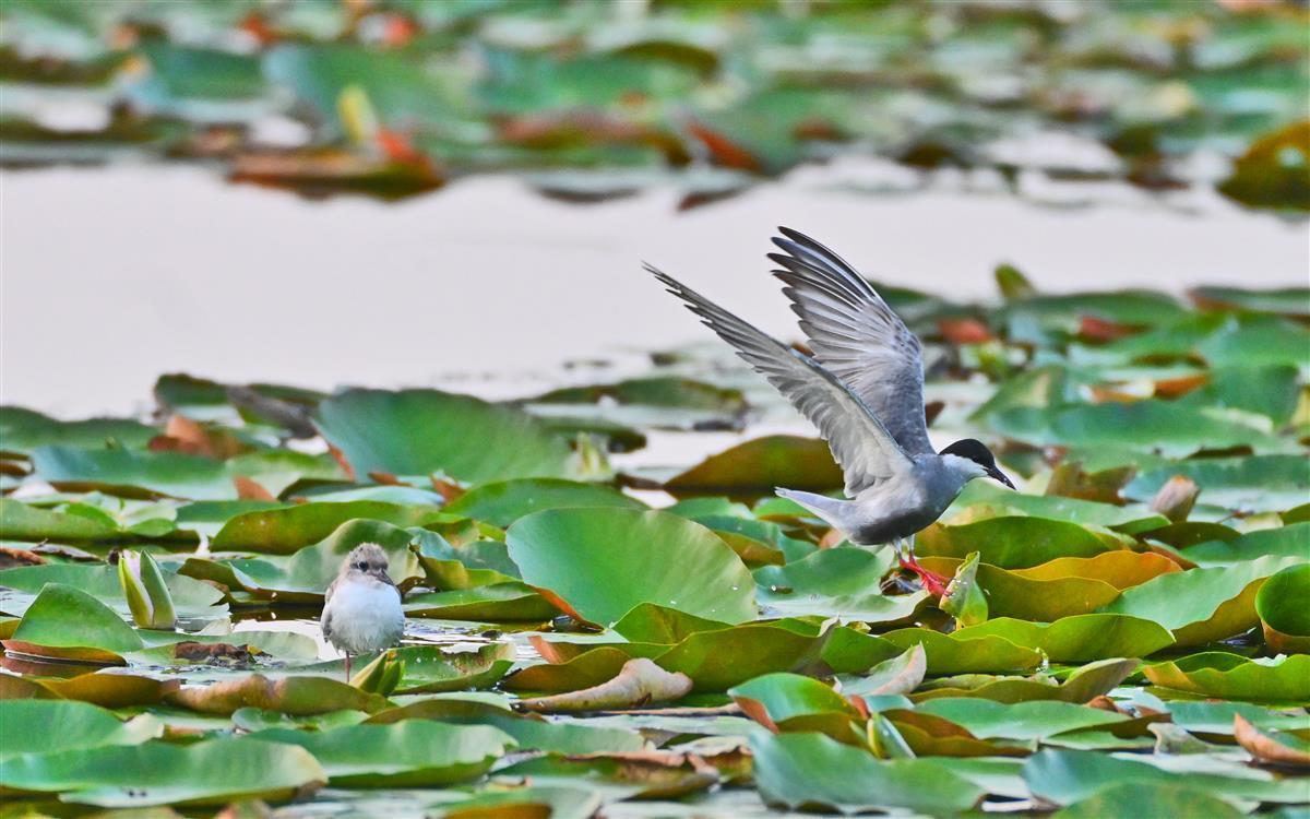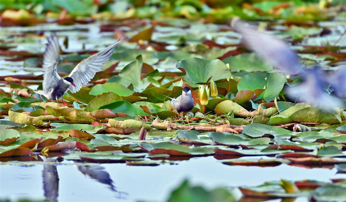 7月17日,枝江市金湖国家湿地公园荷花盛开的湖中,今年新孵出的须浮鸥幼雏时常在水面的荷叶与浮萍叶上嬉戏,成鸟守护在其左右,盛夏的湖面因此显得爱心满满。须浮鸥,为鸥科浮鸥属的鸟类,主要以小鱼、虾、水生昆虫等水生脊椎和无脊椎动物为食,每年6至8月,是须浮鸥繁殖的季节,其每窝通常产2-5枚卵,卵的颜色呈灰绿色。大约经过20天的孵化,雏鸟开始出壳。近年来,枝江金湖国家湿地公园积极开展湿地保护和生态修复,生态环境得到明显改善,湿地综合效益日益显现,每年都有大量须浮鸥、水雉、白鹭等鸟类在金湖湿地栖息繁衍,金湖已成为名副其实的“候鸟驿站”和“城市绿心”。