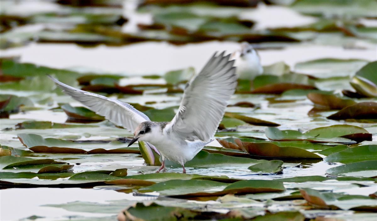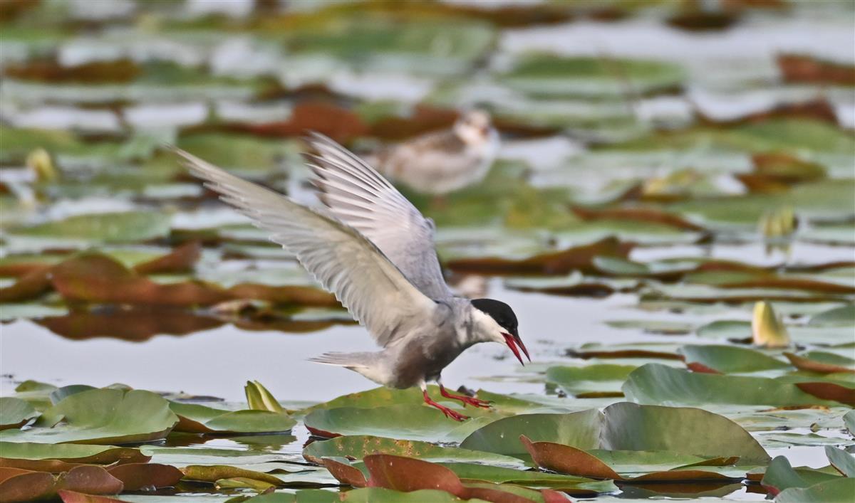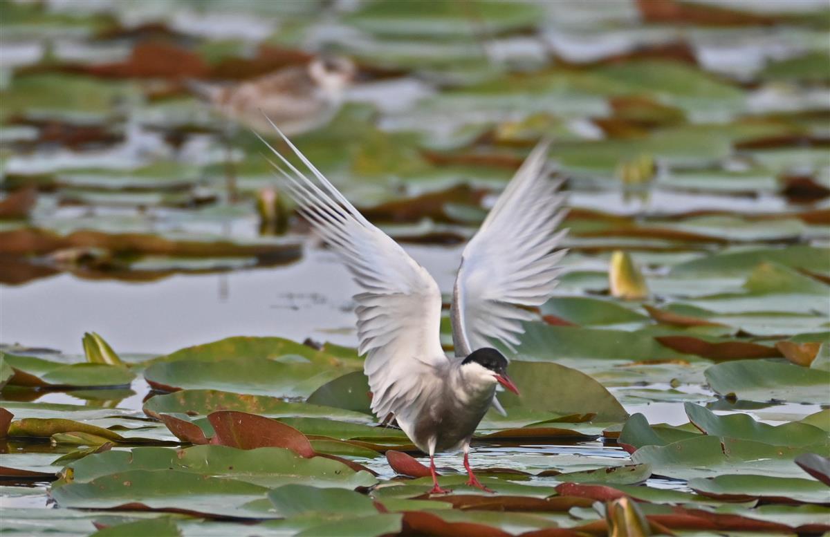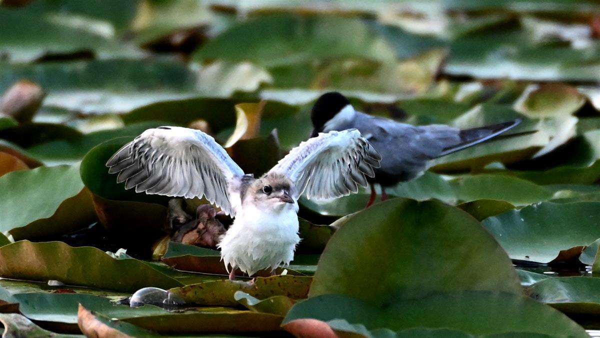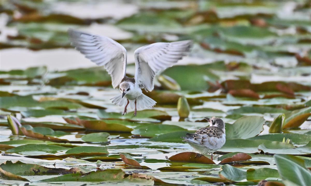 7月17日,枝江市金湖国家湿地公园荷花盛开的湖中,今年新孵出的须浮鸥幼雏时常在水面的荷叶与浮萍叶上嬉戏,成鸟守护在其左右,盛夏的湖面因此显得爱心满满。须浮鸥,为鸥科浮鸥属的鸟类,主要以小鱼、虾、水生昆虫等水生脊椎和无脊椎动物为食,每年6至8月,是须浮鸥繁殖的季节,其每窝通常产2-5枚卵,卵的颜色呈灰绿色。大约经过20天的孵化,雏鸟开始出壳。近年来,枝江金湖国家湿地公园积极开展湿地保护和生态修复,生态环境得到明显改善,湿地综合效益日益显现,每年都有大量须浮鸥、水雉、白鹭等鸟类在金湖湿地栖息繁衍,金湖已成为名副其实的“候鸟驿站”和“城市绿心”。