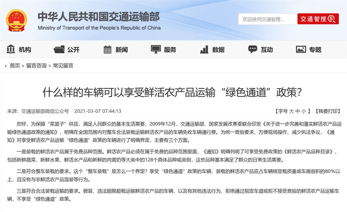 记者查询交通运输部官网发现,《关于进一步完善和落实鲜活农产品运输绿色通道政策的通知》明确,享受鲜活农产品运输“绿色通道”政策的车辆主要有三个方面,其中一点是符合整车装载的要求:装载的鲜活农产品应占车辆核定载质量或车厢容积的80%以上,且没有与非鲜活农产品混装等行为。