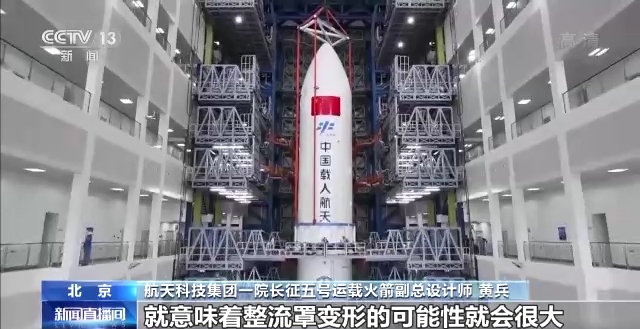 航天科技集团一院长征五号运载火箭副总设计师 黄兵:这么大的一个整流罩确实在国际上都是很少见的,它越大越长,就意味着整流罩可能会变形的。重量也比原来的重了很多,要把它有效地给分离出去,和我们的空间站还不发生一些碰撞,难度也是非常大的。所有这些风险都是要通过地面的一些实验来得到一个充分的验证。
