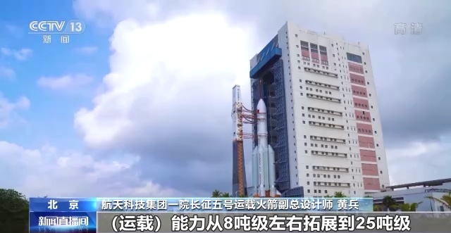 航天科技集团一院长征五号运载火箭副总设计师 黄兵:长五B是我们长五系列中的一个构型,它作为一个近地轨道能力最大的构型存在,担负的其实就是把近地轨道上的(运载)能力从8吨级左右,拓展到25吨级。把我们的运转能力大幅提升,也成了我们开展空间站(建设)的一个必要条件。