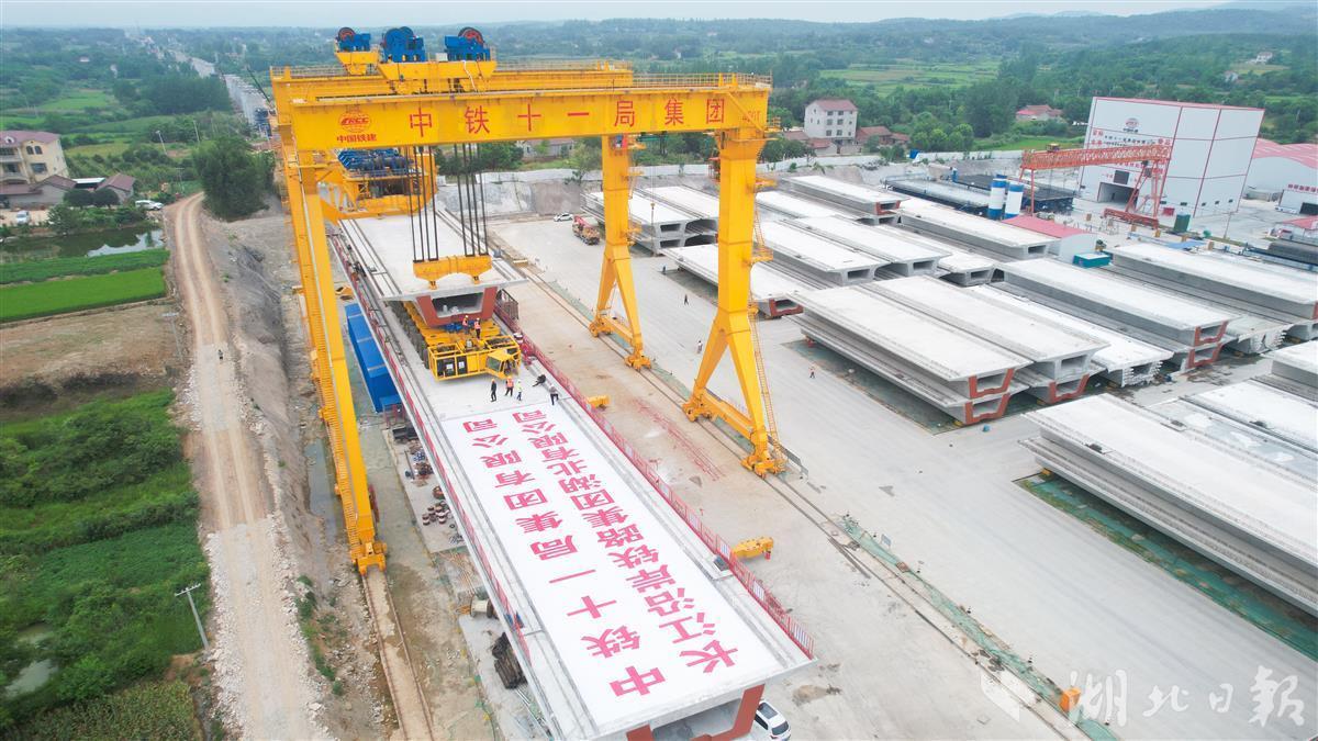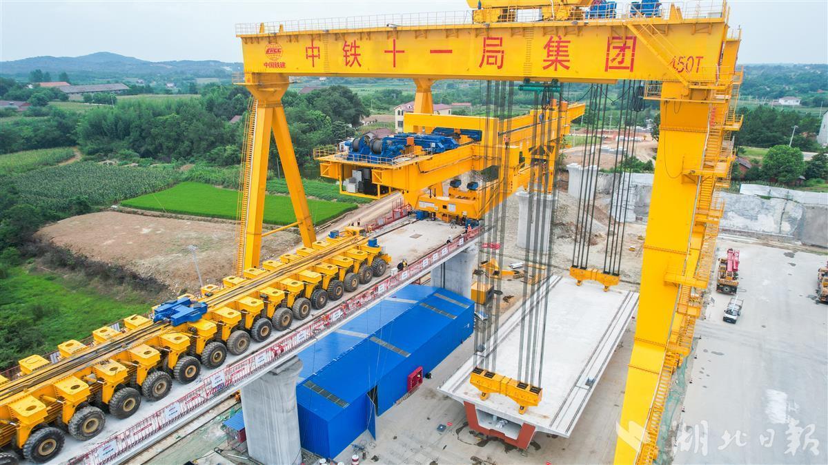 湖北日报讯(记者林晶、通讯员杨光、赵越、实习生康兰欣)架桥机上线,沪渝蓉高铁(沿江高铁)武宜段迎来新进展。7月18日,在钟祥市沪渝蓉高铁跨长荆铁路特大桥施工现场,中铁十一局施工人员操控架桥机,将长32.6米、重约900吨的箱梁,稳稳地架设在211号至212号的桥墩上,成为沪渝蓉高铁武宜段架桥机架设的首榀箱梁,标志着该段进入全面架梁阶段。