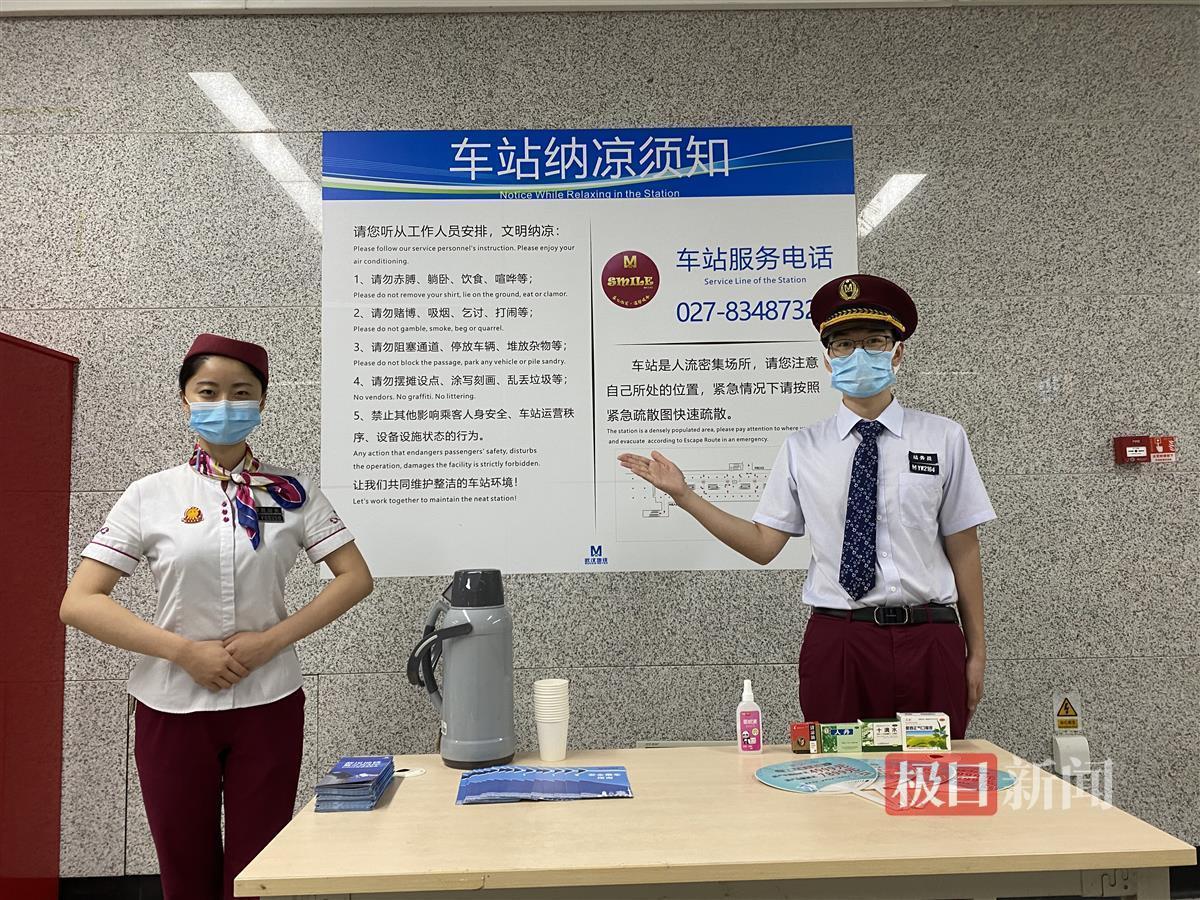 极目新闻记者从武汉地铁运营公司了解到,夏日里,武汉地铁全线网所有车站均向有纳凉需求的市民开放,有条件的车站开辟了纳凉专区,准备了防暑药品和座椅,例如香港路站在凉爽又僻静的地方圈出一片区域,湖北大学站还特意准备了温开水。
