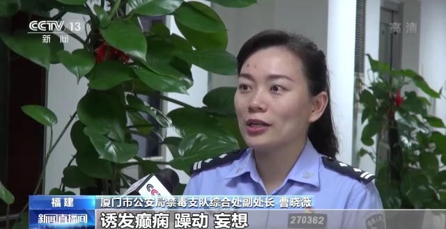 厦门市公安局禁毒支队综合处副处长 曹晓薇:新型毒品不是潮流,对我们广大群众特别是青少年的身心伤害是很大的,容易上瘾,依赖性强,容易促使吸食者产生暴力倾向和攻击行为,诱发癫痫、躁动、妄想等急性精神障碍,过度吸食还可能出现猝死。