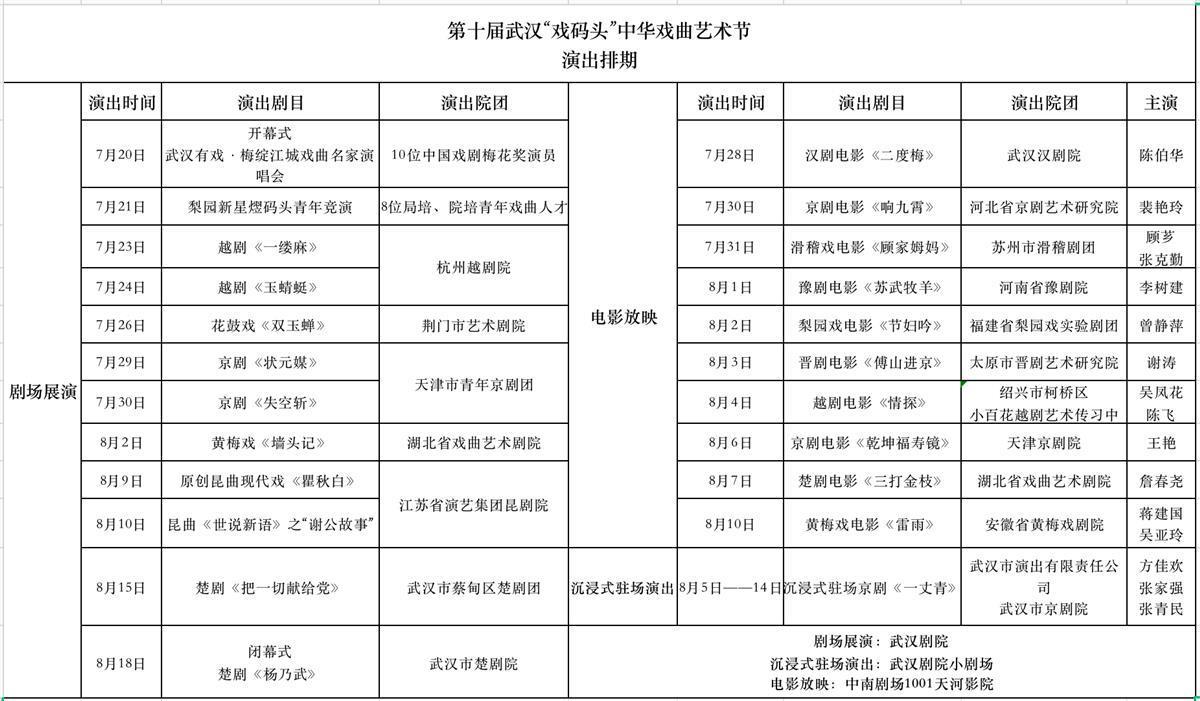湖北日报讯(记者严芳婷、通讯员陈琨、滑凌云)第十届武汉“戏码头”中华戏曲艺术节将于7月20日在汉启幕。本届戏曲艺术节历时30天,将有17家优秀戏曲院团带来32场精彩演出,19位梅花奖演员将来汉共襄盛会,13位梅花大奖、二度梅和梅花奖获得者领衔主演的戏曲电影将集中展映。