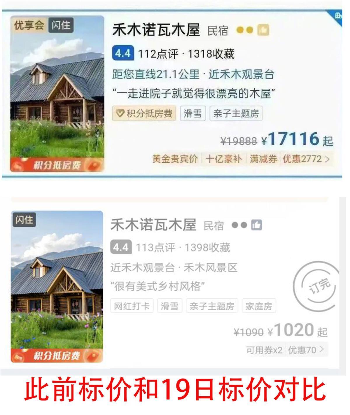 极目新闻记者在某旅行平台检索发现,此前网上标价17116元一晚的禾木诺瓦木屋,现在的标价仅为1020元,单价直降16096元。对此,郑女士表示,这个标价应该是该民宿别墅中一间房的价格。