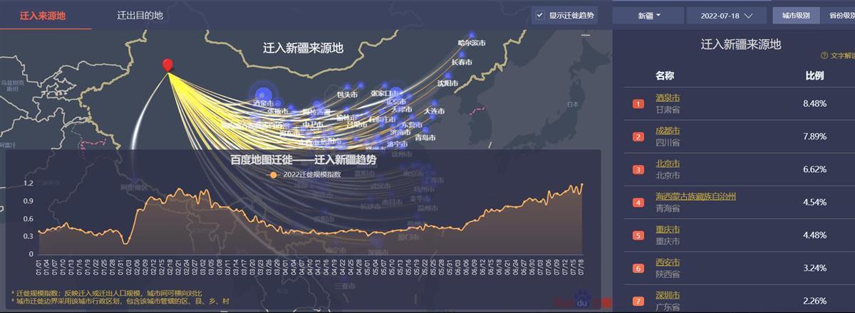 邓爱民认为,目前的新疆旅游热是国内热,将来新疆应该向着世界热门旅游地的方向发展布局。极目新闻记者通过查询百度迁徙地图发现,近10日内,从距离较近的酒泉、成都迁入到新疆的人口占比一直占据前两位,近10日从北京迁入到新疆的人口占比呈持续增加的趋势。其中,7月18日,从北京迁入新疆人口占当日迁入新疆人口的6.62%,位列第三,已经逼近排名前两位的酒泉和成都。在迁入来源城市占比排名前20的城市中,有12个为省会城市,由此可在一定程度上反映出,全国各地有越来越多的人正在涌入新疆。