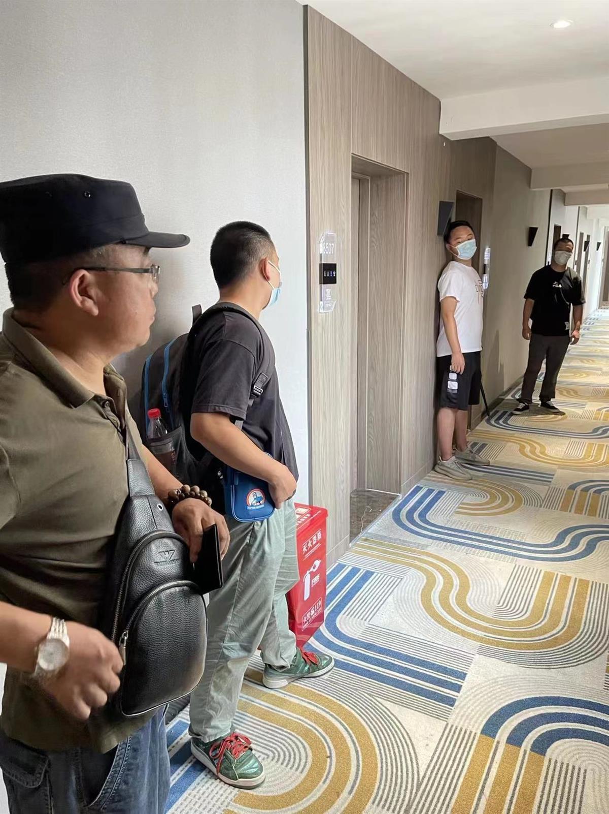 民警在酒店走廊蹲守