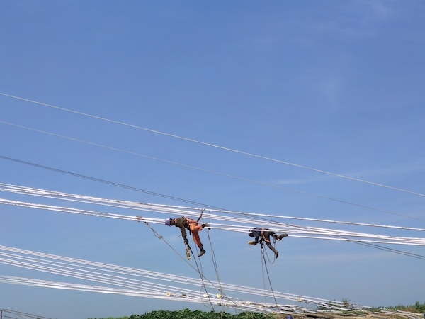 7月18日上午10时,骄阳似火。在南阳—荆门—长沙1000千伏特高压交流线路工程(湖北段)监利市杨祠村施工现场,穿着橡胶鞋的电力施工师傅们用机器将一盘盘导线升上天空,豆大的汗珠顺着他们的脸颊不停地滴落。
