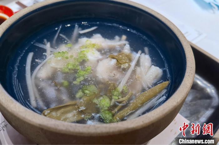 “玉带羹”为莼菜与笋丝同羹,清鲜可口。 孙虹 摄