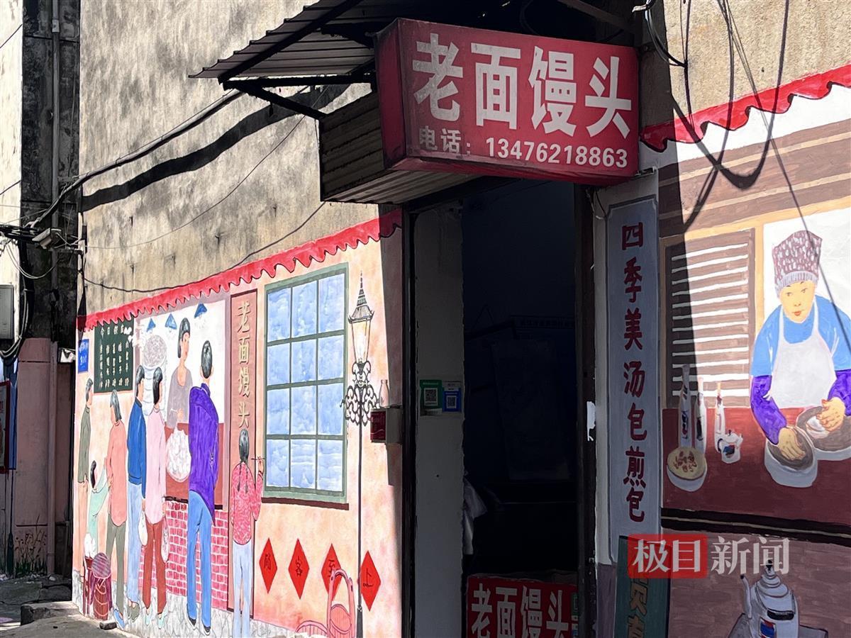 上午10点多,巷子中的“老面馒头”店热闹拥挤了一早上后,安静了下来。忙活了一早上的老板娘见记者站在墙面前打量着,打开了话茬说,“居民朋友们都说这是为我免费打广告呢”!