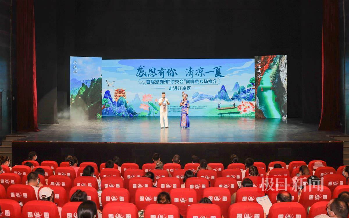 7月20日下午3时许,一曲《盛世欢歌》在武汉中南剧场响起,鹤峰人将感恩之情融入土家歌舞,首届恩施州“凉交会”鹤峰专场推介活动走进“大江金岸”。