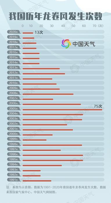 从年际变化来看,龙卷风发生的周期性也较为明显。根据1991年至2020年记录到的龙卷风资料统计,我国平均每年有38个龙卷风。二十世纪90年代中期至本世纪初发生龙卷风相对较多;二十世纪90年代初期以及2006年至2020年发生龙卷风相对较少。其中,2005年龙卷风个数最多,达75个,2020年最少,仅13个。
