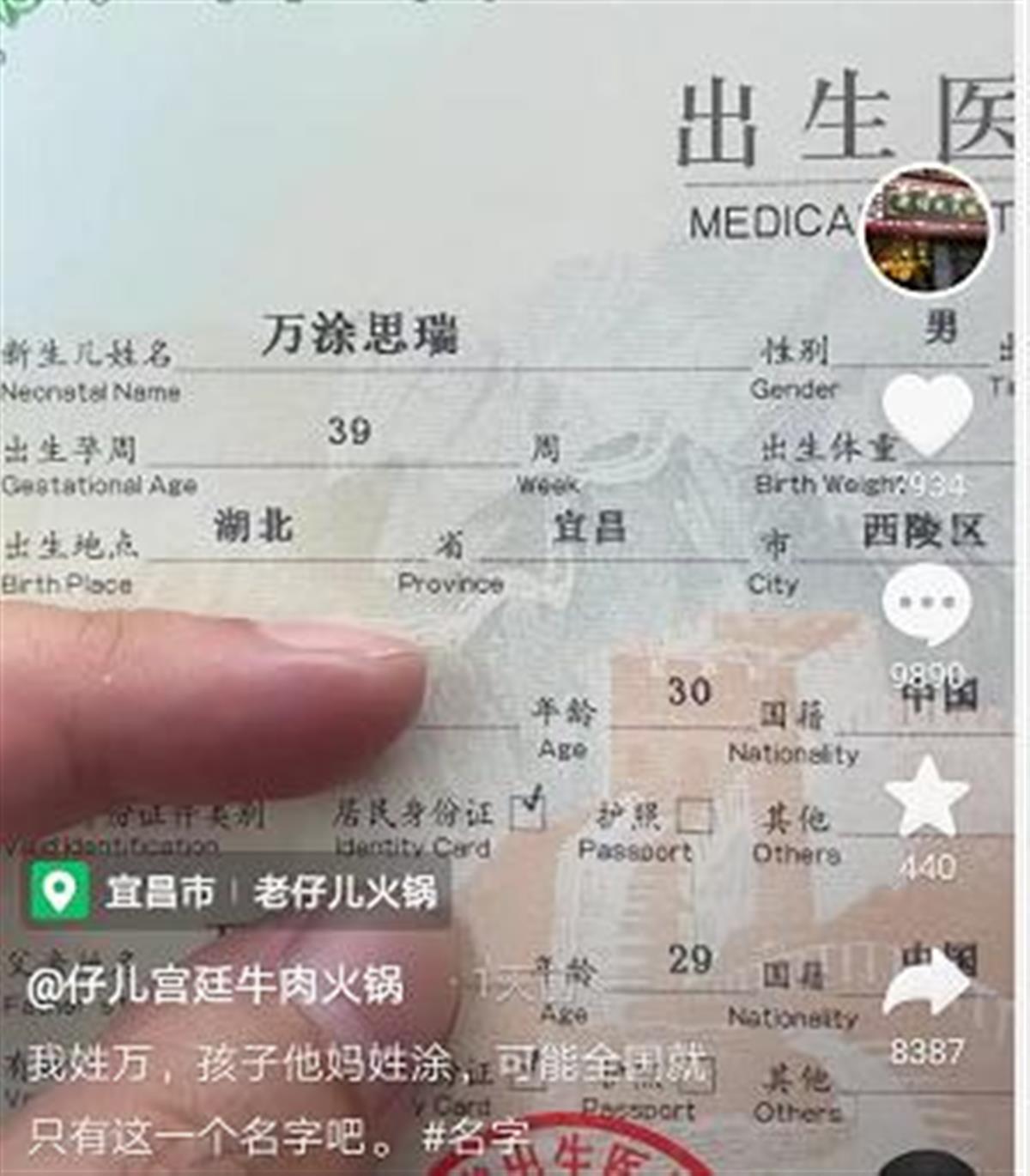 湖北宜昌一名小朋友7月15日出生,他的医学出生证明被晒到网上,引起网友的热议,全因他爸妈给他取了一个特别的名字——万涂思瑞。