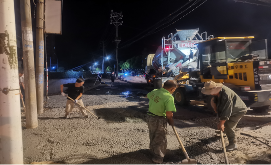 7月18日晚,在蒲阳大道与富水河堤桥头交界处的道路硬化施工现场,施工队正干得热火朝天。