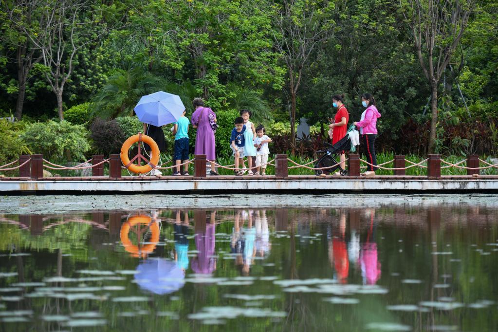 市民群众在茅洲河畔的燕罗湿地公园里遛弯(7月8日摄)。新华社记者梁旭 摄