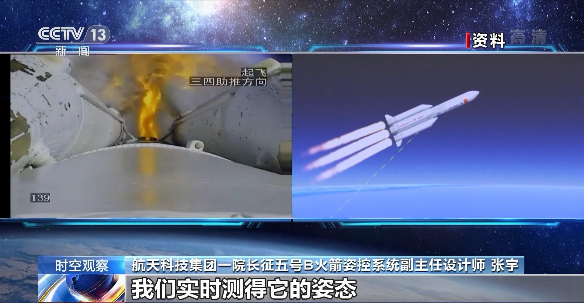 航天科技集团一院长征五号B火箭姿控系统副主任设计师 张宇:就是发动机关机到空间站(实验舱)的分离,我们还有5秒多的时间,我们实时测得它的姿态,对参数进行了一个特别细微的调整,来进行最后的偏差控制,提高分离时候的姿态精度。