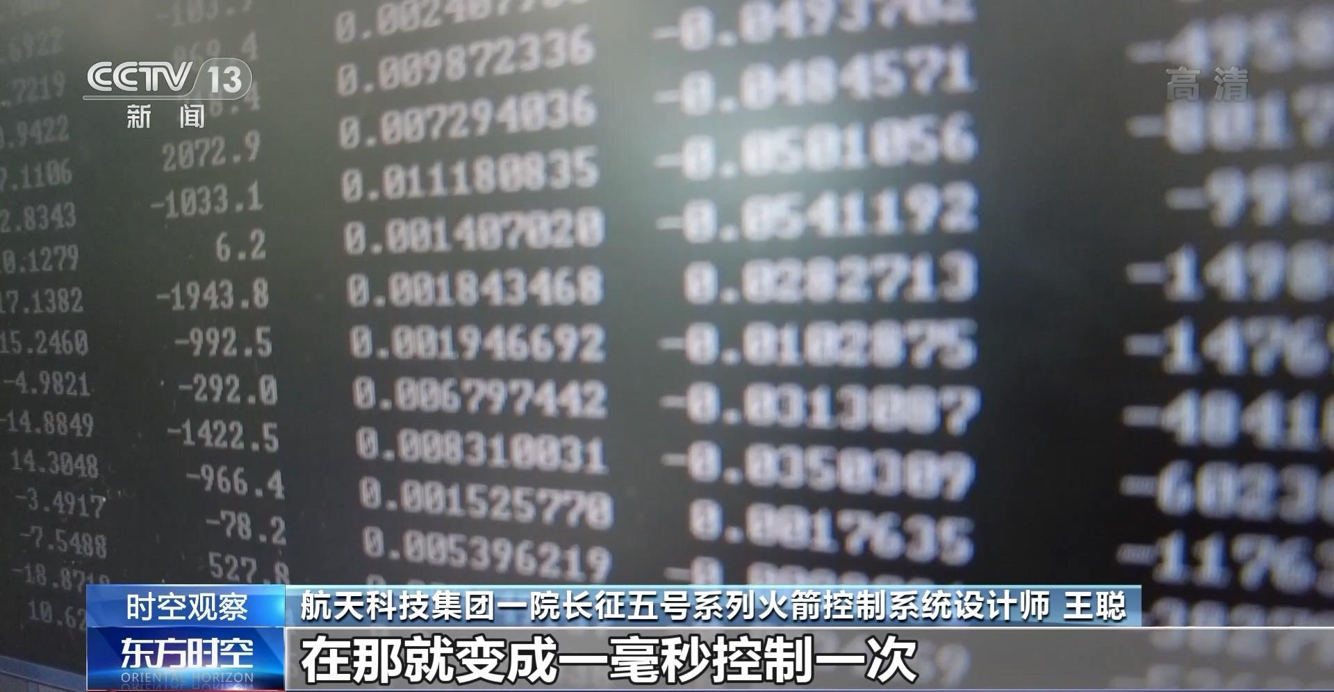 航天科技集团一院长征五号系列火箭控制统设计师 王聪:每一秒它就会走7800米,每一毫秒就七八米。你要入轨,它是对速度位置是有一个严格的要求的。发出关机的指令要准确,本来20毫秒控制一次,在那就变成一毫秒控制一次。