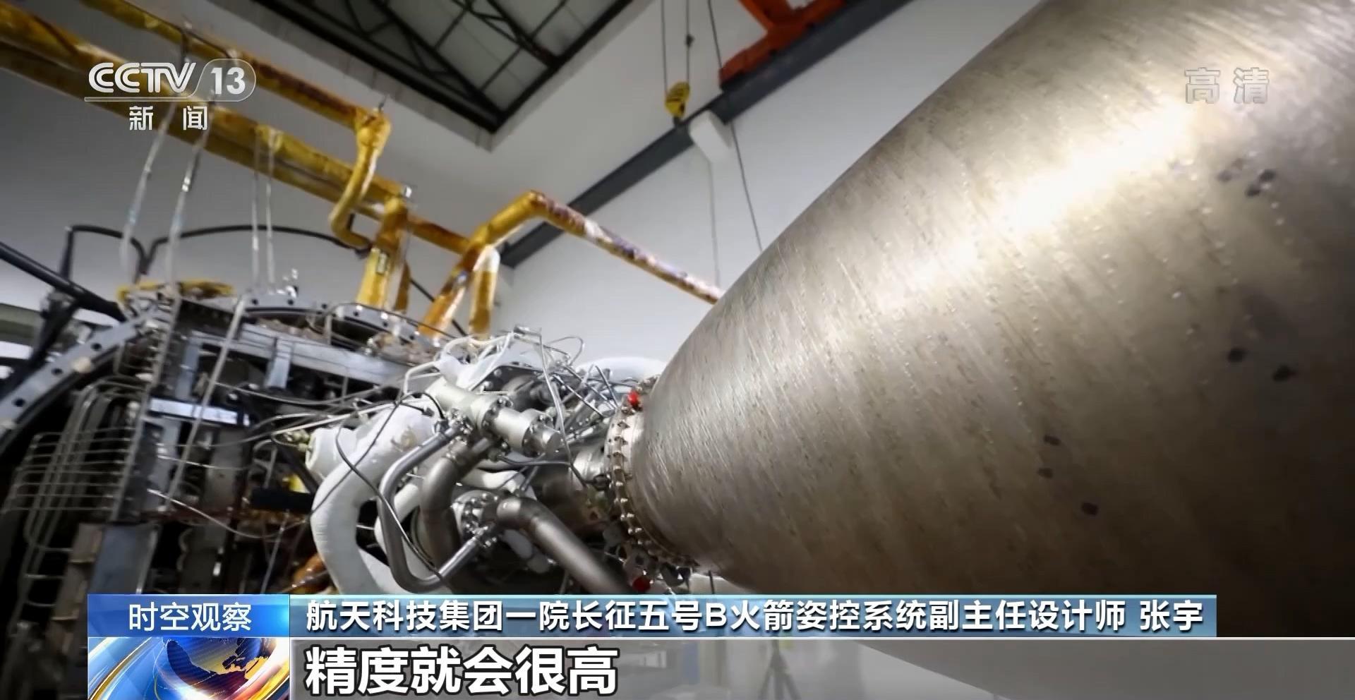 航天科技集团一院长征五号B火箭姿控系统副主任设计师 张宇:比如说像其他的火箭,我们末级会有那种小的姿控喷管,它的推力很小,用推力很小的东西来控制姿态,精度就会很高。你用一个很大的东西来控制它的时候,这个可以想象精度就没有那么高,难度就出来了。