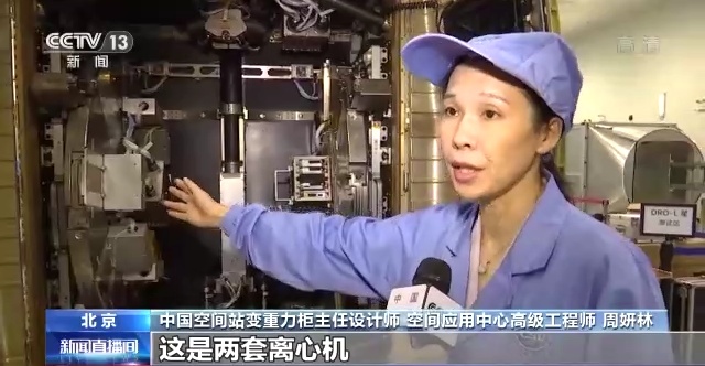 中国空间站变重力柜主任设计师、空间应用中心高级工程师 周妍林:离心机是我们做变重力实验的主要场所了。大家知道旋转的转盘它会给上面的物体提供一个向外的一个力——离心力,我们就是这利用离心力来模拟重力,然后通过转盘转速的调整,来得到不同的重力的模拟。比如说月球的1/6g,火星的1/3g,为了以后我们登月、登火星,为前期的理论研究做准备。