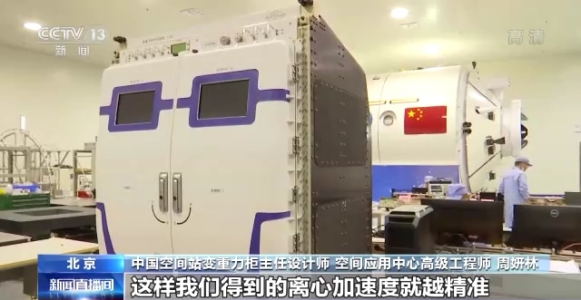 中国空间站变重力柜主任设计师、空间应用中心高级工程师 周妍林:这是目前在轨运行的最大的离心机的尺度了。国际空间站以前最大也就做到600mm,我们现在是900mm的直径。以前可能不能做的实验,中大型的动物植物类的实验就可以放上来了。同时尺寸越大,它的重力梯度就会越小,这样我们得到的离心加速度就越精准。
