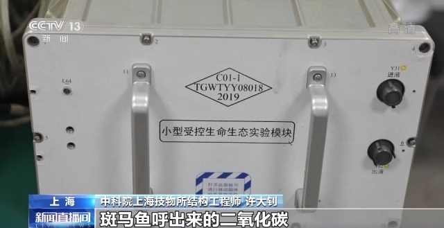 中科院上海技物所结构工程师 许大钊:这个小型受控生命生态实验系统,我们内部俗称它是养鱼的一个设备,目前安排的是斑马鱼和水藻的一个受控的生命生态实验系统。也就是说在这个系统里,藻类通过光照产生的氧气供斑马鱼进行生存,斑马鱼呼出来的二氧化碳供藻类进行光合作用。这是一个全部密封的设备,它通过整个设备自给自足的一个自循环,我们来研究它生态系统的一个变化。因为在天上是没有浮力的,所以鱼的各种姿态可能也都是科学家研究的一个重点,我们地面上也会同步进行一个比对实验,当实验进行到一定周期的时候,宇航员就需要介入,帮科学家采集一些数据,比如说取一些水样,或者说是斑马鱼进行产卵之后,取一些鱼卵带回地面。