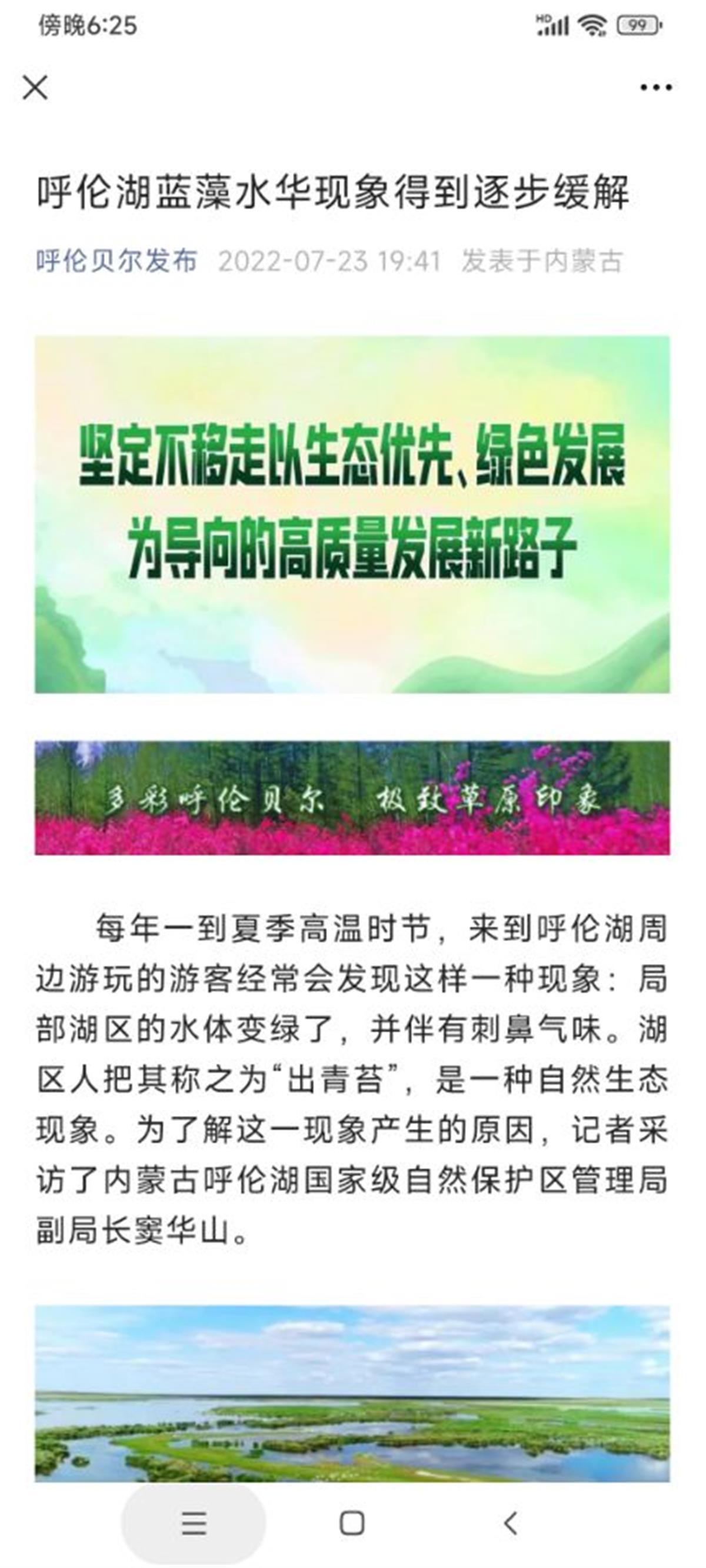 极目新闻记者注意到,7月23日晚,呼伦贝尔市委宣传部官方微信公众号“呼伦贝尔发布”发布了《呼伦湖蓝藻水华现象得到逐步缓解》报道。报道称,“每年一到夏季高温季节,来到呼伦湖周边游玩的游客经常会发现这样一种现象:局部湖区的水体变绿了,并伴有刺鼻气味。湖区人把其称为‘出青苔’,是一种自然生态现象。”内蒙古呼伦湖国家级自然保护区管理局副局长窦华山介绍,“出青苔”称为“水华”,其出现和水体中的低等植物蓝藻有关,是水体富营养化的特征。目前,呼伦湖的水体处于中度富营养化的状态。