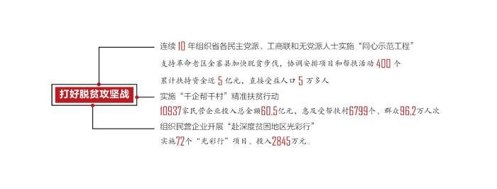 引导统一战线成员投身疫情防控和民生改善。围绕统筹疫情防控和经济社会发展,引导统一战线成员发挥优势、积极作为,医护人员白衣逆行、奋战一线;各界人士献计出力、踊跃捐赠,捐赠的各类防护物资和善款累计超过8.5亿元人民币。围绕打好脱贫攻坚战,连续10年组织省各民主党派、工商联和无党派人士实施“同心示范工程”,支持革命老区金寨县加快脱贫步伐,协调安排项目和帮扶活动400个,累计扶持资金近5亿元,直接受益人口5万多人;实施“千企帮千村”精准扶贫行动,10937家民营企业投入总金额60.5亿元,惠及受帮扶村6799个、群众96.2万人次;组织民营企业开展“赴深度贫困地区光彩行”,实施72个“光彩行”项目、投入2845万元。围绕巩固拓展脱贫攻坚成果同乡村振兴有效衔接,谋划打造“同心示范工程”提质升级版,启动“万企兴万村”行动等,引导统战成员奔赴共同富裕新征程。