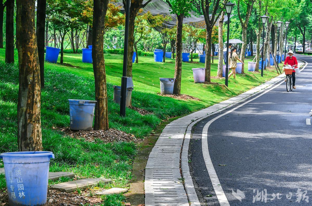 7月26日,武汉市洪山区杨春湖公园中,许多树木都“抱”着一个塑料水桶,桶内存着一定量的水,桶身上有“抗旱专用、抗旱保苗桶”等字样,成就公园神奇的风景。