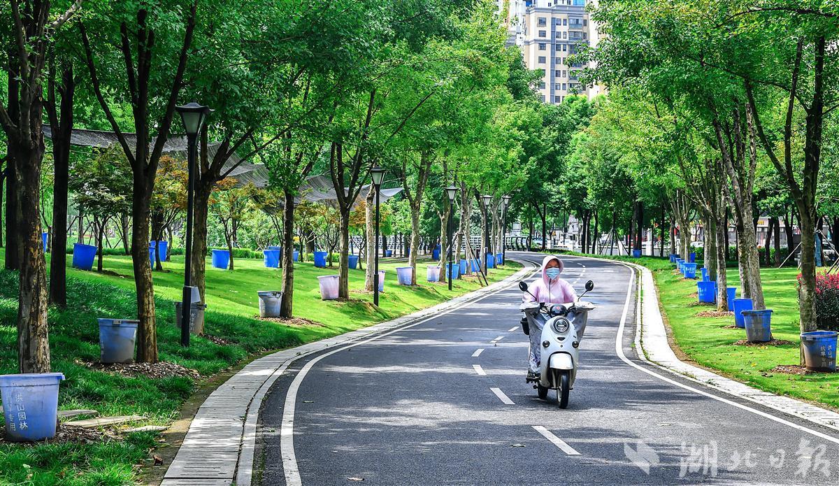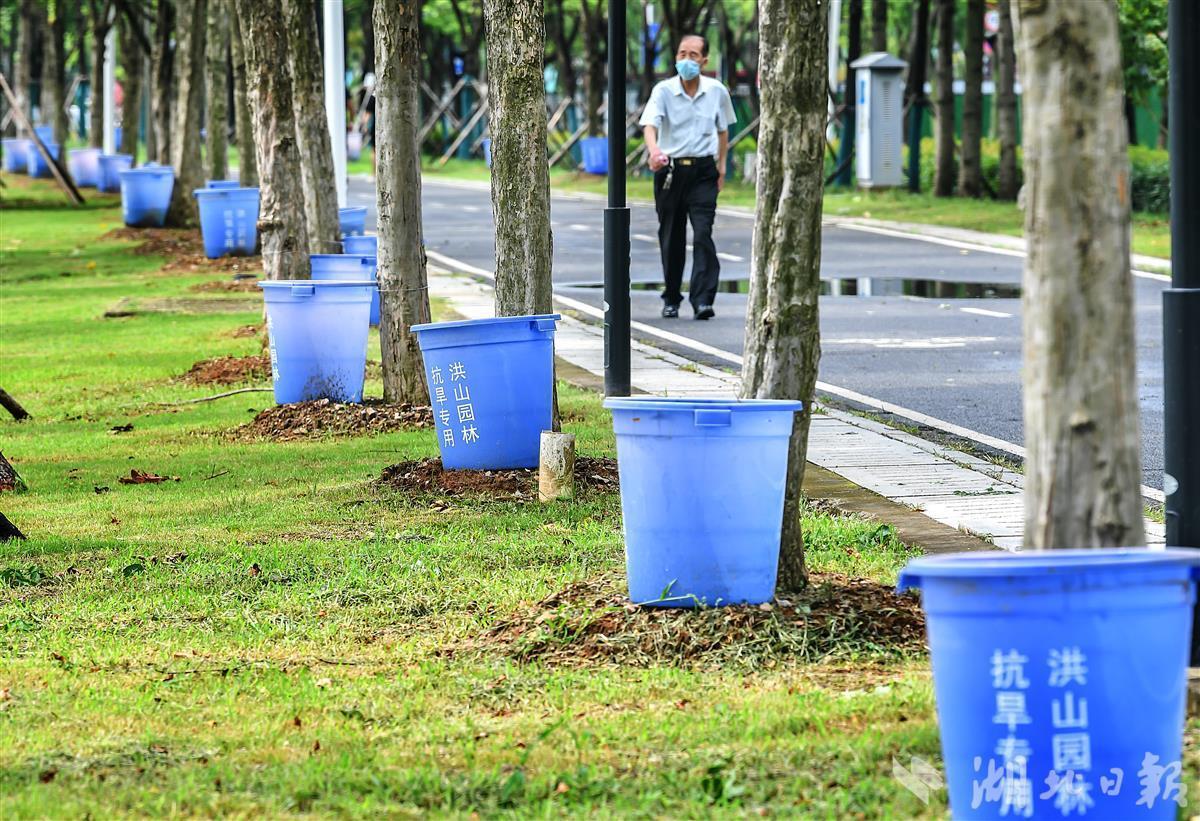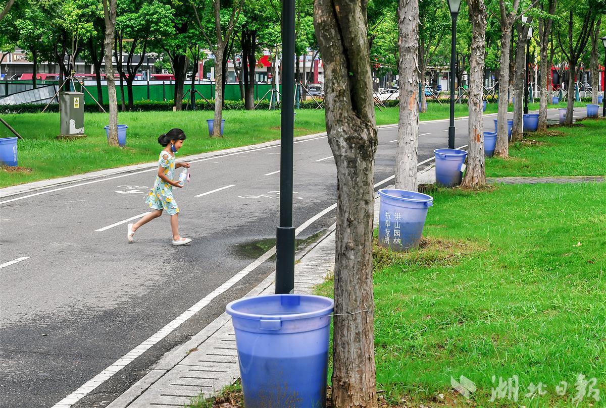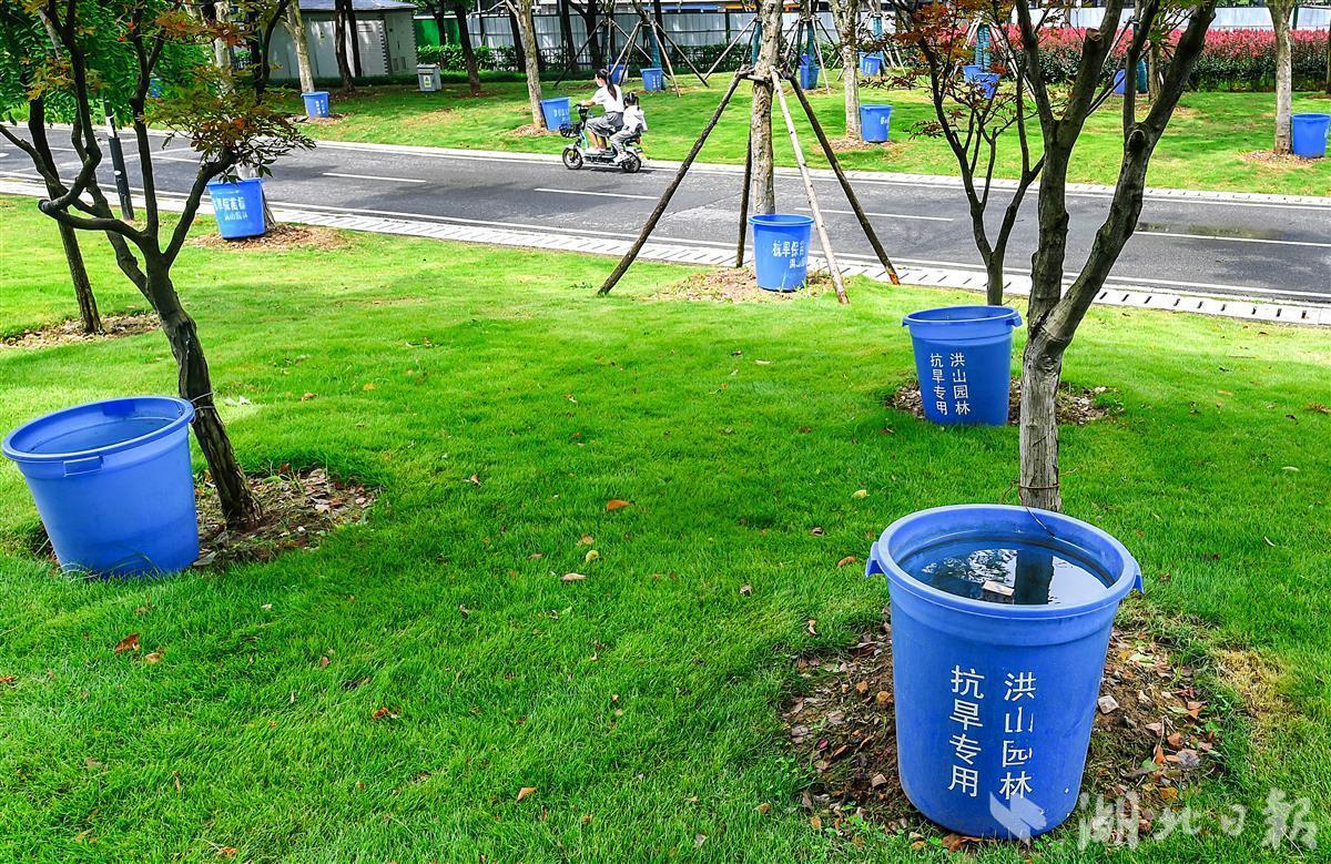 据了解,“一树一桶”的树木抗旱方式,近年来在武汉三镇园林灌溉工作中兴起。节省人力的同时,滴水渗透也能保证树木充分吸收水分,有利于提高新栽苗木的抗旱能力。(湖北日报全媒记者 朱熙勇 摄)