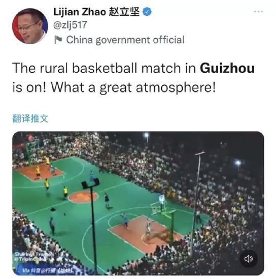 赵立坚又点赞贵州了!近日,贵州台江县的一场乡村篮球赛引起他的关注,在推特上,他发文并配以视频进行了点赞!推文写道“一场贵州乡村篮球赛正在举行,现场氛围真的太赞了!”