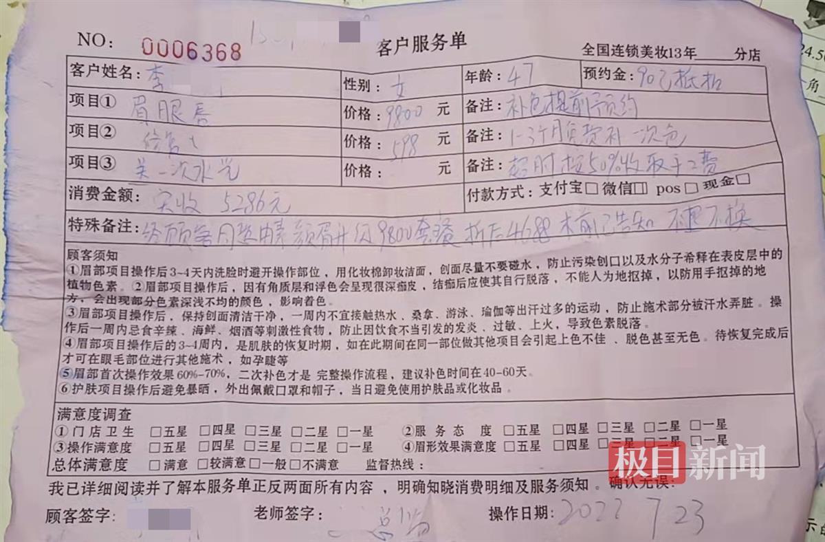在李女士提供的一张“客户服务单”上,极目新闻记者看到,特殊备注中写着“经顾客同意,由素颜眉升级9800套餐,折后4688,术前已告之,不退不换”。