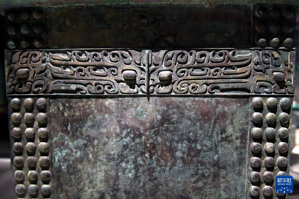 这是郑州商都遗址博物院内展出的兽面纹铜方鼎(复制品)局部(7月26日摄)。