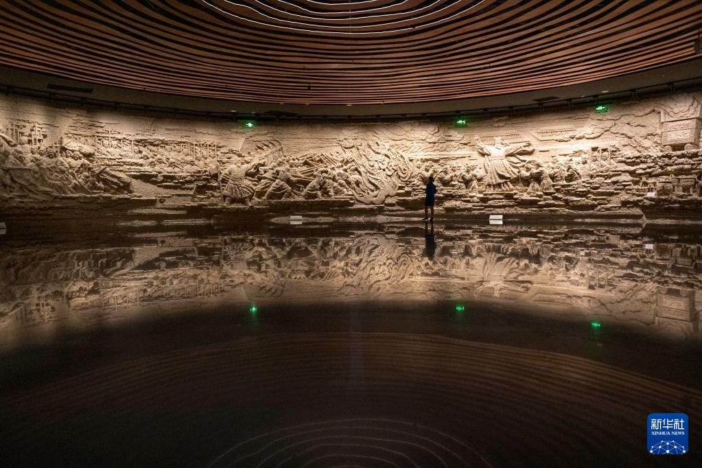 这是在郑州商都遗址博物院展厅内拍摄的环形浮雕墙(7月26日摄)。