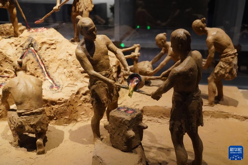 这是在郑州商都遗址博物院内拍摄的复原的铸铜场景(7月26日摄)。